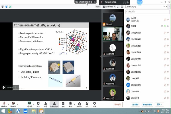12月14日晚,杭州师范大学张国强老师应邀在线上为机电工程学院光电信息科学与工程专业学生和部分教师作了题为“腔磁振子混合系统中的双稳与相变”的学术报告。报告会由机电工程学院许业军老师主持。